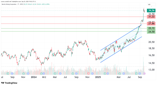 Die am 5. September 2025 vorgestellte Idee, mit einem Call-Optionsschein (WKN JU30ZS) mit dem Basispreis von 28,00 US-Dollar und Fälligkeit am 18.06.2026 auf eine steigende Aktie der Barrick Corporation zu setzen, schloss gestern zum Geldkurs von 7,48 Euro und lag mit 180 Prozent im Plus. Der Basiswert befindet sich noch in einem Aufwärtstrend, was ein Anpassen des Stop Loss Levels beim Derivat über dem Break Even Kurs ermöglicht. Das Stop Loss Level beim Optionsschein könnte bei 6,62 Euro vorgesehen werden.