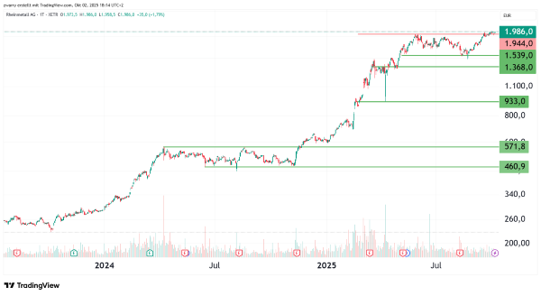 Die am 22. August 2025 vorgestellte Idee, mit einem Call-Optionsschein (WKN JF85WH) mit dem Basispreis von 1.650,00 Euro und Fälligkeit am 18.12.2026 auf eine steigende Aktie der Rheinmetall AG zu setzen, schloss gestern zum Geldkurs von 5,63 Euro und lag mit 82 Prozent im Plus. Der Basiswert befindet sich noch in einem Aufwärtstrend, was ein Anpassen des Stop Loss Levels beim Derivat über dem Break Even Kurs ermöglicht. Das Stop Loss Level beim Optionsschein könnte bei 5,44 Euro vorgesehen werden.
