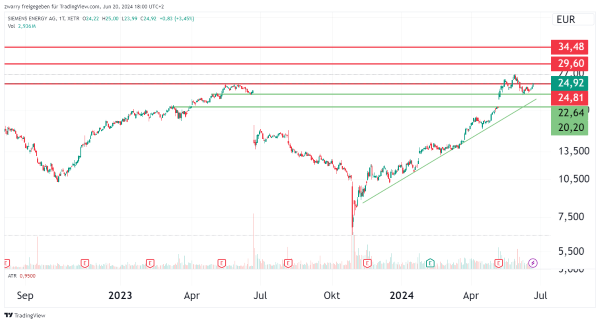 Zumindest in der Einschätzung der Marktteilnehmer ist der Turnaround bei Siemens Energy (ENR) geschafft. Seit dem absoluten Tiefstand am 26. Oktober 2023 bei 6,40 Euro hat der Kurs um 285 Prozent zugelegt. Ab dem 15. Mai 2024 mussten die Bullen jedoch eine Pause einlegen, was sich in einer noch bestehenden Seitwärtsbewegung deutlich gezeigt hat. In den letzten Handelstagen hat der Kurs jedoch wieder nach oben gedreht. Dabei hat das Bankhaus Metzler seine Bewertung auf "Buy" mit einem Kursziel von 29,60 Euro beibehalten. Bis zum bisherigen Höchststand von 34,48 Euro beträgt der Kursgewinn nur noch etwa 17 Prozent. Aktuell testet das Papier die Widerstandszone rund um den Wert bei 24,81 Euro. Eine Überwindung dieser Zone entspräche auch der Bildung eines Kaufsignals, womit der Weg bis zum Wert bei 29,60 Euro frei wäre. Vom gestrigen Niveau aus betrachtet würde dies einer ungehebelten Wertsteigerung von etwa 19 Prozent entsprechen. Da ENR auch von der Umstrukturierung des Stromnetzes profitieren wird, ist davon auszugehen, dass der Kurs langfristig unterstützt wird.