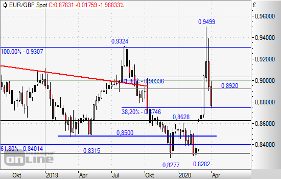 Nach einem Verlaufshoch bei 0,9499 und einer äußerst steilen Rallye stellte sich gegen Ende März schließlich eine nicht unerwartete Korrekturbewegung bei EUR/GBP ein. Um zu identifizieren, wo sich potenzielle Unterstützungsmarken sowie Trendwendepunkte befinden, würden dabei die Fibonacci-Reihen 61,8 bzw. 38,2 % projiziert. Letzterer nährt sich das Paar nun an und sollte möglichst an dieser wieder kehrtmachen. Wenn nicht, schwinden die Chancen auf eine baldige Erholung des Euro erheblich und eine Korrekturausdehnung wird sehr wahrscheinlich. An der übergeordneten Handelsspanne der letzten Jahre zwischen 0,8277 und grob 0,9325 GBP dürfte dies vorerst aber wenig ändern.