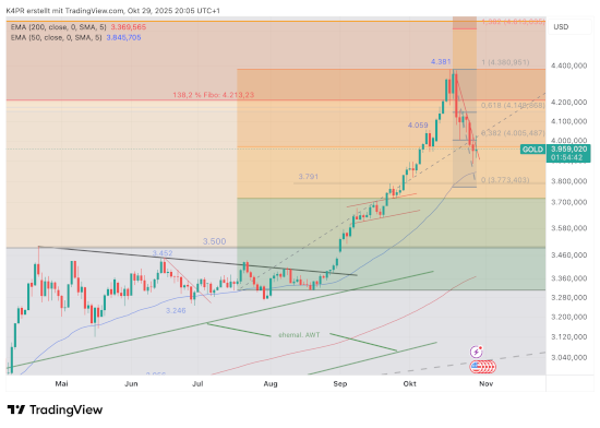 Aus technischer Sicht sind unter den Vorwochentiefs von 3.886 US-Dollar weitere Abschläge zumindest in dem Bereich des 50-Tage-Durchschnitts bei 3.846 Punkten und darunter bis auf 3.719 US-Dollar stark anzunehmen. Erst in diesem Bereich dürfte der Goldpreis wieder einen tragfähigen Boden, bestehend aus einem ehemaligen Widerstandsband aus Ende September, vorfinden und eine längere Erholungsbewegung einläuten. Dies schließt jedoch einen temporären Anstieg bis auf 4.055 US-Dollar nicht aus, von wo aus die genannten Ziele auf der Unterseite abgearbeitet werden dürften. Im beschriebenen Zielkorridor kann in Anschluss nach Bodenbildungstendenzen Ausschau gehalten werden.