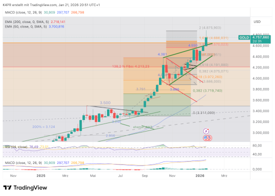 Die erfolgreiche Auflösung des steigenden Keils auf der Oberseite unterstreicht das bullische Sentiment für das Edelmetall Gold und ermöglicht Kurszuwächse auf 4.875 US-Dollar und darüber in den Bereich von 5.135 und schließlich 5.376 US-Dollar. Sollte der Preis jedoch wieder unerwartet unter 4.550 US-Dollar abrutschen, wäre ein Wiedereintritt in den vorherigen Keil nicht auszuschließen, in der Folge müssten empfindliche Abschläge auf 4.386 US-Dollar im Rahmen einer gesunden Konsolidierung eingeplant werden. Nur ein Kursrutsch darunter würde ein bärisches Szenario eröffnen und eine längere Korrektur auslösen.