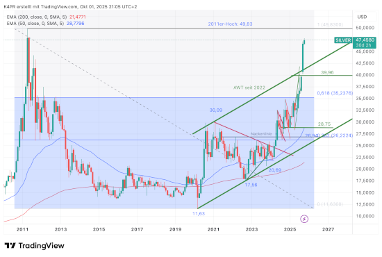 Aus dem Stand heraus ist ein baldiger Test der letzten Verlaufshochs bei 49,83 US-Dollar aus 2012 stark anzunehmen, eine überschießende Welle könnte als Vorbereitung für ein weiteres Kaufsignal sogar auf 55,17 US-Dollar je Feinunze heranreichen und würde sich auch vom gegenwärtigen Niveau aus für ein Long-Investment anbieten. Nach einem anschließenden Pullback könnte im Erfolgsfall das nächsthöhere Ziel bei 64,42 US-Dollar in Angriff genommen werden. Dies allerdings auf mittelfristiger Basis, sodass die Rallye auf Sicht der nächsten Monate weiter andauern sollte. Unterstützend wirkt hierbei ein nachhaltiger Ausbruch aus dem vorausgegangenen Aufwärtstrend, der schon jetzt eine Rallyebeschleunigung zur Folge hat. Ein bärisches Reversal würde sich dagegen erst unter einem Preisniveau von 40,00 US-Dollar mit dem Ergebnis weiterer Rückschläge auf 34,62 US-Dollar ergeben. Aufgrund der Aufwärtsdynamik wird ein derartiges Szenario aber kurzfristig nicht favorisiert.
