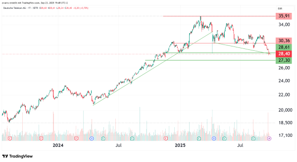 Seit Mitte März 2022 ist langfristig betrachtet wieder Aufwärtsdynamik in der Kursentwicklung der Deutschen Telekom zu beobachten, an der die schrittweise Integration der Tochter T-Mobile US einen großen Anteil hat. Als Folge haben die aus den USA gemeldeten Wachstumszahlen auch die Mutter in Deutschland beflügelt. Hier sticht vor allem die letzte Aufwärtssequenz vom 17. April 2024 bis zum 3. März 2025 heraus, wo der Kurs rund 58 Prozent hinzugewinnen konnte. Seit dem 3. März 2025 ist der Aktienkurs in eine Konsolidierung eingetreten, die bis dato noch intakt erscheint. Besonders der Einstieg von Skylink in den US-Markt kostet dem Kurs Performance. Seit dem 8. September 2025 ist ein Kursrückgang von rund 11 Prozent zu beobachten. Vor diesem Hintergrund belässt das Analysehaus JPMorgan in einer aktuellen Studie die Einstufung für die Deutsche Telekom mit einem Kursziel von 43,50 Euro auf "Overweight". Der gestrige Verlust im Ausmaß von 0,70 Prozent führte zum Test der Unterstützungszone bei 28,61 Euro. Wird diese nachhaltig unterschritten, könnte ein Test der Unterstützung bei 27,30 Euro bevorstehen. In dieser Zone könnte eine Bodenbildung Platz greifen, wodurch der Kurs wieder die Chance auf Kurssteigerung bis auf 32,50 Euro hätte.