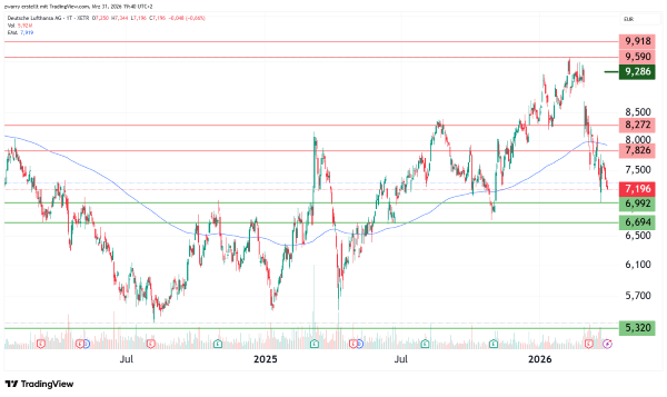 Der Aktienkurs der Deutschen Lufthansa notiert aktuell weit unter dem Allzeithoch von Anfang Januar 2018 bei 22,308 Euro. Seit dem Kurstief während der Pandemie bei 4,887 Euro konnte die Aktie keine nachhaltige Aufwärtsbewegung verzeichnen. Auch das teilweise erreichte Hoch bei 11,160 Euro gilt als Fehlausbruch, da der Kurs anschließend wieder zurückfiel. Zusammenfassend hat die Lufthansa-Aktie nach der Pandemie eine Seitwärtsbewegung zwischen einer Unterstützung bei 5,320 Euro und dem Widerstand bei 9,918 Euro ausgebildet. Der letzte Ausbruchsversuch erfolgte am 10. Februar 2026 bei 9,590 Euro. Aktuell notiert die Aktie wieder auf dem Niveau von 7,196 Euro. Entscheidend für die Bewertung der Lufthansa-Aktie ist derzeit der Krieg im Mittleren Osten. Sollte dieser Konflikt andauern und weitere Produktionskapazitäten nicht nur blockiert, sondern auch zerstört werden, ist mit steigender Inflation oder sogar einer Stagflation zu rechnen. In diesem Szenario wäre nicht nur mit einem weiteren Kursrückgang der Lufthansa-Aktie zu rechnen, sondern auch mit einem entsprechenden Abwärtstrend für die meisten europäischen Aktien. Der Aktienkurs der Lufthansa könnte in diesem Fall unter die Unterstützung bei 6,694 Euro fallen. Ein baldiger Friedensschluss hingegen könnte zu einem Anstieg des Aktienkursniveaus führen.