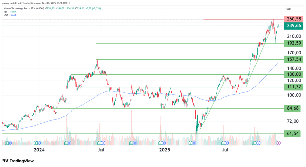 Die Techinsights-Experten erwarten, dass der Boom bei KI-Beschleunigern 2027 ausläuft, was auch die Umsätze von Micron tangieren sollte. Vor gut 16 Monaten markierte der Aktienkurs von Micron Technology sein bisheriges Allzeithoch bei 157,54 US-Dollar. Es folgte eine Konsolidierung, die von einer neunmonatigen Seitwärtsrange abgelöst wurde. Danach wurde auch Micron von dem Selloff aufgrund der angekündigten Zollpolitik im Zuge des Liberation Days erfasst. Mittlerweile ist bei den Marktteilnehmern wieder Zuversicht eingekehrt und der Kurs konnte die Verluste mehr als kompensieren. Vom Tief am 7. April 2025 bei 61,54 US-Dollar gewann das Papier knapp 294 Prozent auf aktuell 242,29 US-Dollar hinzu. Diese Aufwertung besteht aus zwei Aufwärtstrends und einer Seitwärtsrange, wobei am 17. November das Allzeithoch bei 260,58 US-Dollar markiert wurde. Ob der aktuelle Aufwärtstrend grundsätzlich Potenzial hat, sich weiter nach oben zu entwickeln, verrät auch ein Blick auf die fundamentale Kennzahl PEG (Price/Earnings/Growth; KGV/Gewinnwachstum in %). Die enormen Wachstumserwartungen in den Jahren 2025/26 und 2026/27 ergeben jeweils eine PEG-Ratio von 0,79 und 1,29. Trotz des Charakters einer zyklischen Aktie ist dies ein kompetitiver Wert. Aus heutiger Sicht besitzt Micron noch Potenzial nach oben. Sollte der KI-Boom 2027 auslaufen, führt dies zu konservativeren Überlegungen.