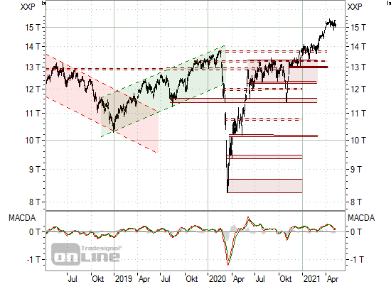 Aus saisonaler Sicht hat der DAX mit dem Ablauf des Börsenmonats April ein sehr starkes Muster beendet. Zwar zeigt die Richtung in der Regel bis Mitte Juli tendenziell weiter nach oben, allerdings blickt der Index mittlerweile auf 14 Hausse-Monate zurück, in welchen er sehr deutlich ansteigen konnte. Eine Überhitzung ist daher durchaus spürbar. Dies macht den Kurs bereits vor dem eigentlich negativen Abschnitt (Mitte Juli bis Ende September) anfällig für eine korrigierende Bewegung. Diese konnte in den kommenden Wochen durchaus bis in die Region um rund 13.800 Punkte reichen. Als Absicherung für eine kurzfristige Short-Position würde sich dann ein Niveau knapp über dem bisherigen Allzeithochs in der Region um rund 15.600 Punkte anbieten.