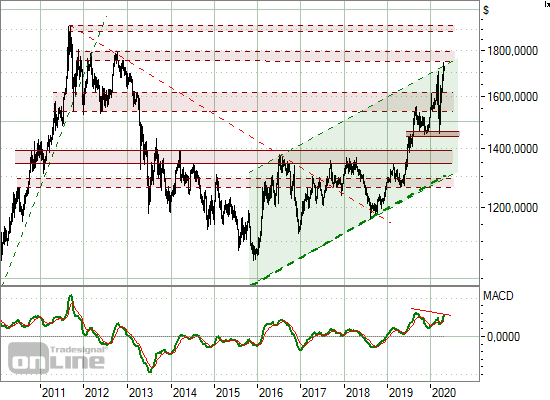 Zwar zeigt der Goldpreis langfristig weiter nach oben, kurzfristig scheint aber noch einmal ein Rücksetzer möglich. Dabei richtet sich der Blick auf die Region um rund 1.400 US-Dollar, die sich als markante Unterstützung erwiesen hat. Sollte der Kurs auch noch unter dieses Niveau fallen, eröffnet sich weiteres Korrekturpotenzial. Als Einstieg bietet es sich an, das Unterschreiten des letzten Zwischentiefs abzuwarten, so dass sich mit einer Stop-Buy-Order bei etwa 1.655 US-Dollar arbeiten lässt. Sollte der Goldpreis hingegen über den Bereich um rund 1.750 US-Dollar klettern, hellt sich das Bild wieder deutlich auf. In diesem Fall würde sich bei rund 1.760 US-Dollar eine Absicherung anbieten.