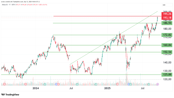 Der Aktienkurs von Airbus befindet sich seit März 2009 in einem Aufwärtstrend, der durch eine hohe Volatilität gekennzeichnet ist. Besonders deutlich wurde dies Mitte Februar 2020, als die Corona-Pandemie zu einem starken Kurseinbruch führte. Ab dem Tiefststand von 47,70 Euro am 18. März 2020 erholte sich der Kurs jedoch vergleichsweise schnell. Der Aufwärtstrend wurde immer wieder durch Korrekturen unterbrochen. Die letzte größere Korrektur erfolgte Anfang April 2025 im Zusammenhang mit dem sogenannten Liberation Day, an dem der amerikanische Präsident die Einführung von Zöllen für eine Vielzahl von Ländern ankündigte. Da die globale Flugzeugindustrie stark arbeitsteilig organisiert ist, war der Aktienkurs von Airbus von den Zöllen besonders betroffen. Da die tatsächlichen Zölle jedoch vergleichsweise niedrig ausfielen und Airbus weiterhin ausreichend Spielraum für den Export seiner Flugzeuge in die USA hat, konnte sich der Kurs deutlich erholen. Am 11. September 2025 wurde mit 195,26 Euro sogar ein neues Allzeithoch erreicht. Dabei wurde im Vorfeld der Widerstand bei 186,94 Euro im dritten Anlauf überwunden. Positiv für die Kursentwicklung in der aktuellen geopolitischen Lage wirkt sich zudem die neue Partnerschaft mit Kratos Defense aus, die die Lieferung von Kampfdrohnen an Deutschland vorsieht. Nach dem Überschreiten des bisherigen Allzeithochs könnte der Kurs weiter auf 216,00 Euro steigen. Fundamental betrachtet steigt der Gewinn pro Aktie kontinuierlich, was für das Jahr 2027 ein erwartetes Kurs-Gewinn-Verhältnis (KGV) von 19,96 ergibt. Die Aktie gilt somit nicht mehr als günstig, dennoch wird ein weiteres Gewinnwachstum über das Jahr 2027 hinaus erwartet.