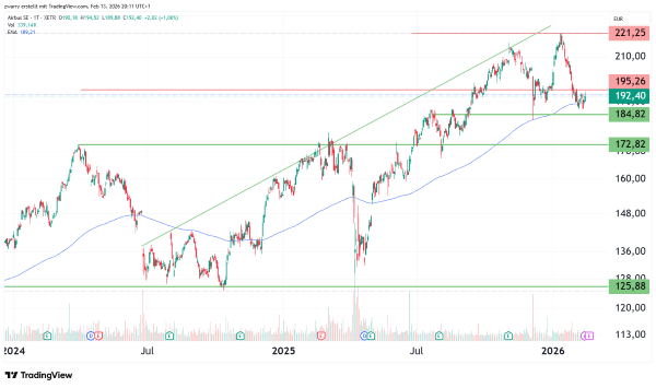Der Aktienkurs von Airbus befindet sich seit März 2009 in einer Aufwärtsbewegung, die durch eine hohe Volatilität gekennzeichnet ist. Die Aufwärtsbewegung wurde immer wieder durch ausgeprägte Korrekturen unterbrochen. Die letzte größere Korrektur erfolgte Anfang April 2025 im Zusammenhang mit dem sogenannten Liberation-Day, an dem der amerikanische Präsident die Einführung von Zöllen für eine Vielzahl von Ländern ankündigte. Da die globale Flugzeugindustrie stark arbeitsteilig organisiert ist, war der Aktienkurs von Airbus von den Zöllen besonders betroffen. Da die tatsächlichen Zölle jedoch vergleichsweise niedrig ausfielen und Airbus weiterhin ausreichend Spielraum für den Export seiner Flugzeuge in die USA hat, konnte sich der Kurs deutlich erholen. Am 14. Januar 2026 wurde mit 221,25 Euro sogar ein neues Allzeithoch erreicht. In weiterer Folge notiert der Kurs aktuell bei 192,40 Euro und damit rund 12 Prozent unter dem Allzeithoch. Im großen Bild ist der langfristige Aufwärtstrend intakt und der Kurs notiert wieder über der 200-Tage-Linie. Der letzte Kursrückgang wurde von der Unterstützung bei 184,82 Euro gebremst und entwickelt sich wieder nach oben. Ob diese Wende nachhaltig ist, sollte am 19. Februar entschieden werden, wenn Airbus die Bücher öffnet.