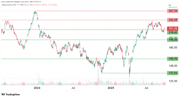 Der Aktienkurs von Boeing hat sich seit dem Tief aufgrund des von Donald Trump ausgerufenen Liberation Day wieder in das obere Viertel der seit April 2020 andauernden Seitwärtsrange bewegt.