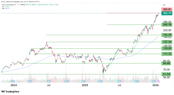Die Experten von Techinsights gehen davon aus, dass der Boom bei KI-Beschleunigern im Jahr 2027 endet, was auch die Umsätze von Micron beeinflussen dürfte. Vor etwa 19 Monaten erreichte der Aktienkurs von Micron Technology mit 157,54 US-Dollar sein bisheriges Allzeithoch. Anschließend folgte eine Konsolidierungsphase, die von einer neunmonatigen Seitwärtsbewegung abgelöst wurde. Danach wurde auch Micron von dem Kursrückgang infolge der angekündigten Zollpolitik im Rahmen des Liberation Days betroffen. Inzwischen ist bei den Marktteilnehmern wieder Zuversicht eingekehrt, und der Kurs konnte die Verluste mehr als ausgleichen. Seit dem Tief am 7. April 2025 bei 61,54 US-Dollar stieg die Aktie um knapp 490 Prozent auf aktuell 362,75 US-Dollar. Diese Aufwertung setzt sich aus drei Aufwärtstrends und zwei Seitwärtsphasen zusammen. Am Freitag, dem 16. Januar 2026, wurde mit 365,81 US-Dollar ein neues Allzeithoch erreicht. Ob der aktuelle Aufwärtstrend grundsätzlich weiteres Potenzial nach oben bietet, zeigt auch ein Blick auf die fundamentale Kennzahl PEG (Price/Earnings/Growth; Kurs-Gewinn-Verhältnis im Verhältnis zum Gewinnwachstum in Prozent). Die hohen Wachstumserwartungen für die Jahre 2025/26 und 2026/27 führen jeweils zu einer PEG-Ratio von 0,79 beziehungsweise 1,29. Trotz des zyklischen Charakters der Aktie ist dies ein wettbewerbsfähiger Wert. Aus heutiger Sicht besitzt Micron somit noch Aufwärtspotenzial. Sollte der KI-Boom im Jahr 2027 jedoch enden, sind konservativere Einschätzungen angebracht.